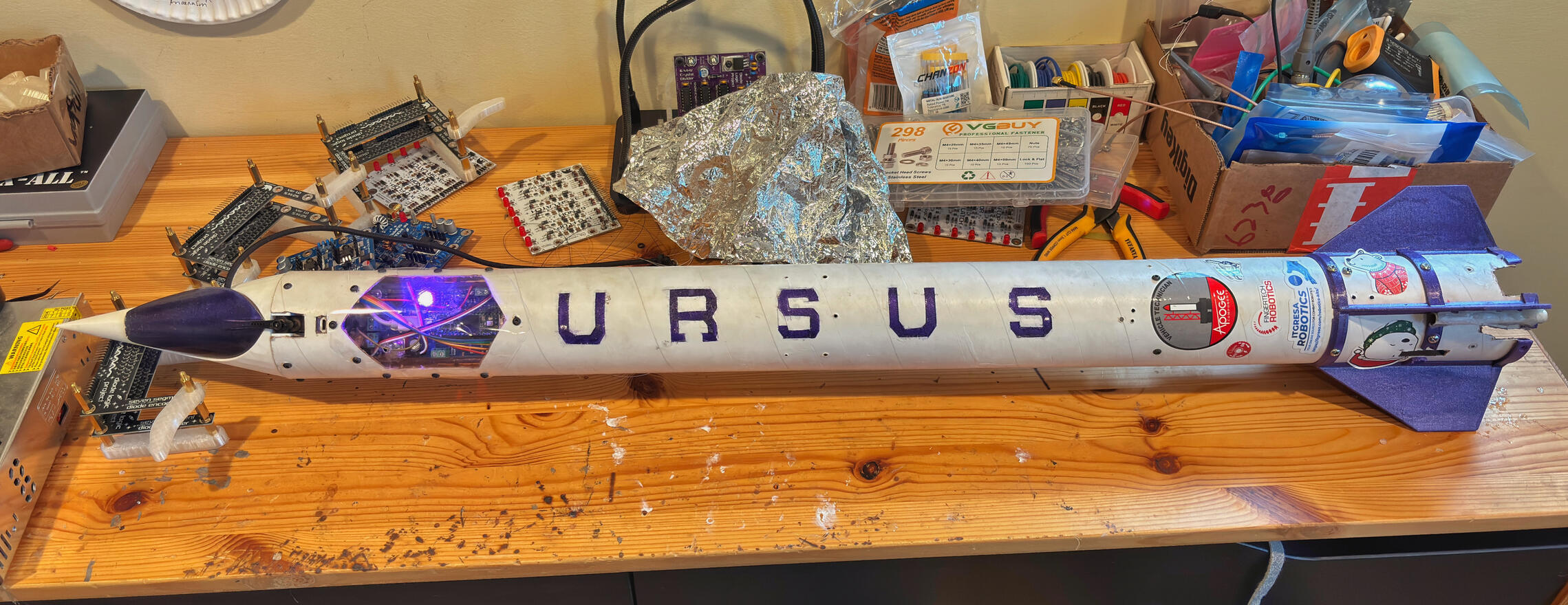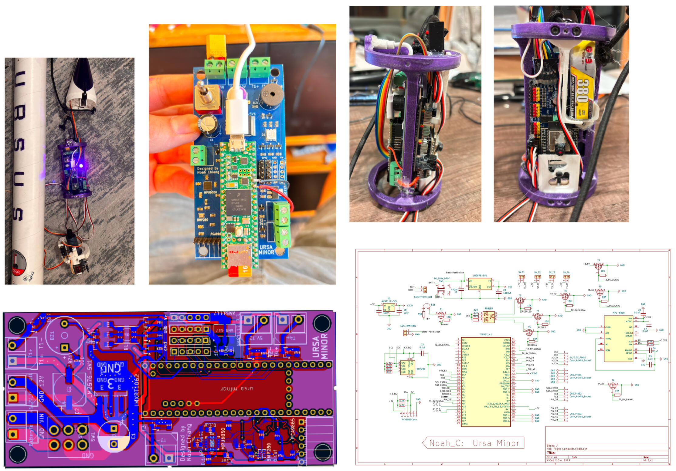 I started my flight computer with the help of BPS.space tutorials. My version has some slight changes: a Teensy 4.1 instead of 3.6 and an MPU6050 IMU instead of BNO055. I also added a servo driver to save the Teensy the task of sending PWM signals to the various servos. Capturing onboard video was a priority: I added an ESP32 camera module, which doubled as the rocket’s point of communication with the ground station. The Teensy conveniently has an SD card slot for data storage.I had accidentally designed the PCB to use a switching 5V regulator instead of a linear regulator, so I never added an inductor. This caused the Teensy to randomly turn off for a few weeks until I discovered the problem and replaced it with an external voltage regulator IC. I had also used the wrong pins for I2C communication because of an inaccurate KiCad symbol, which I fixed by carving out traces and wiring externally. I used purple spray paint to decorate Ursus and the avionics bay.